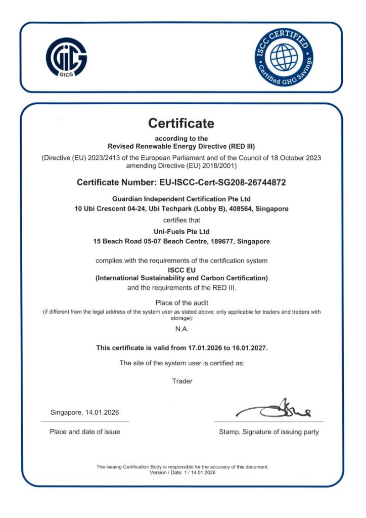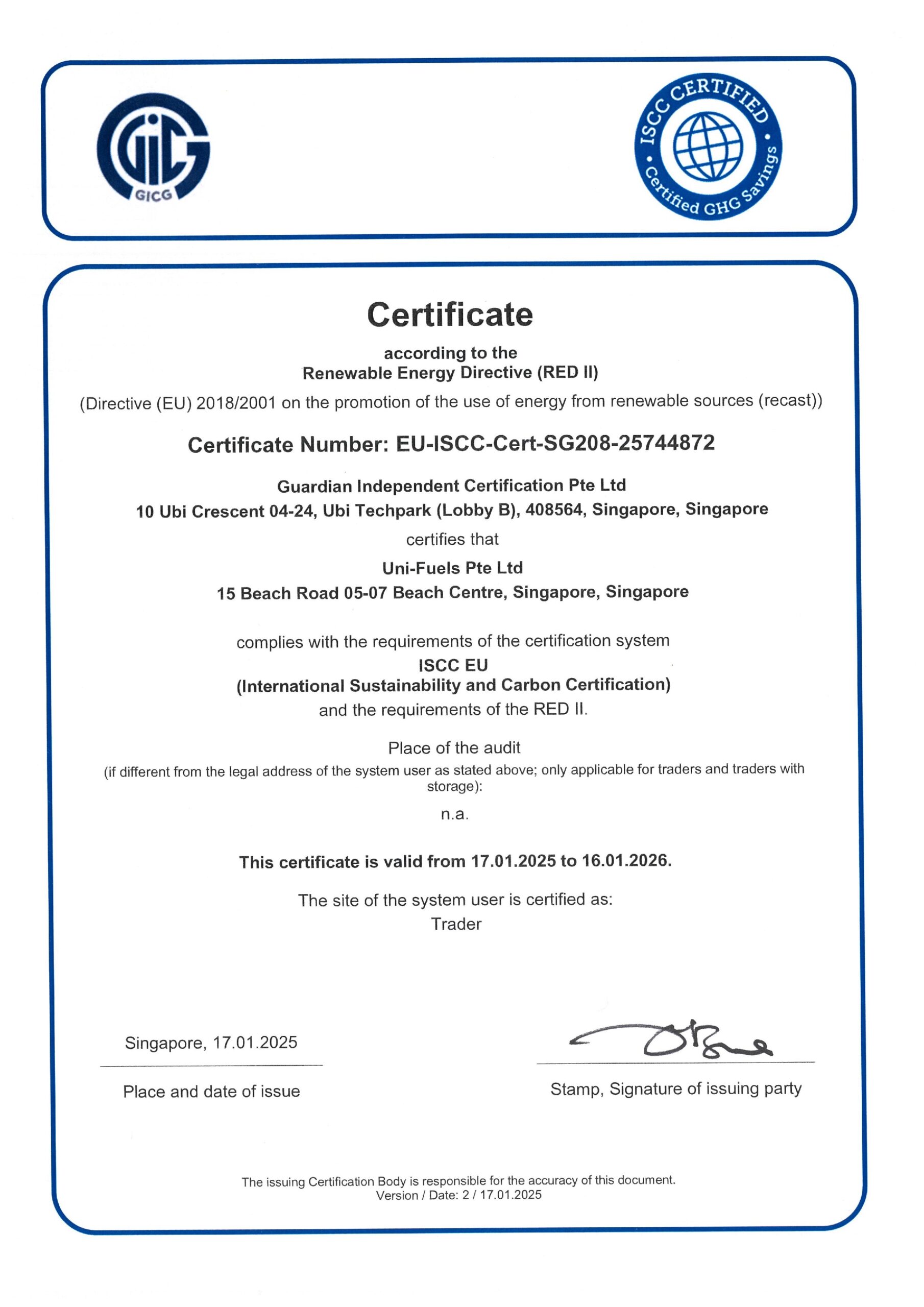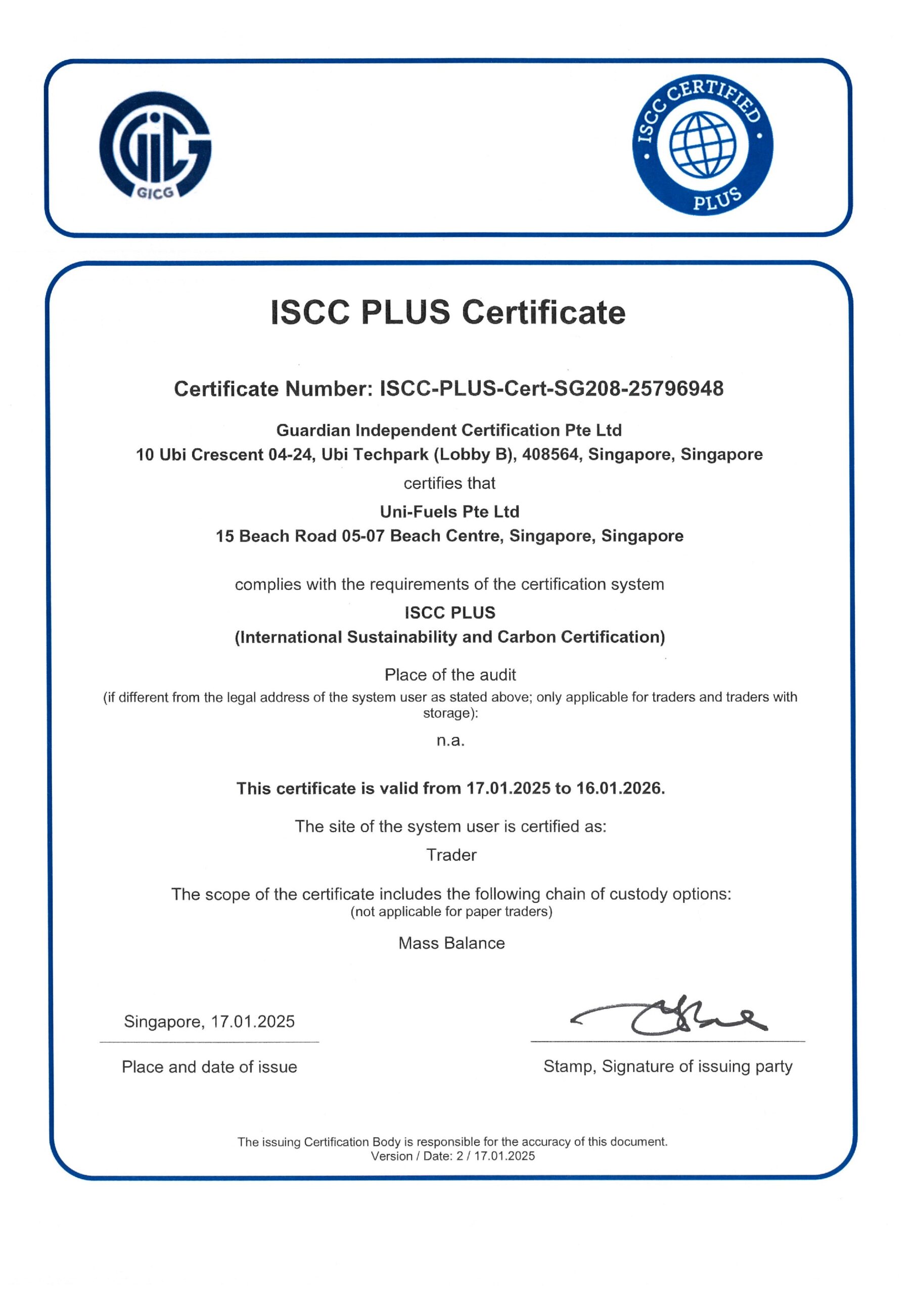 We are dedicated to facilitate our customers’ efforts in exploring and validating alternative fuel and carbon reduction solutions. Our commitments include developing a roster of alternative fuel supply candidates that meet regulatory requirements, trading of ISCC-certified biofuels and providing carbon credits and offsets solutions.